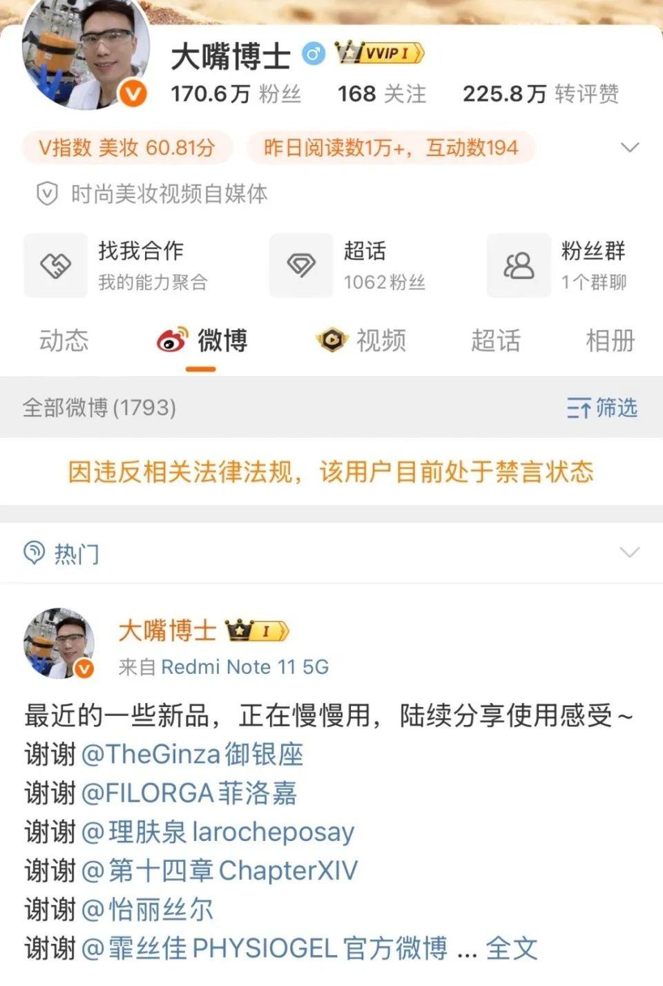 美妆博主“大嘴博士”微博账号已经被禁言,多条视频已经下架。此前,该账号曾发布多条视频,质疑巨子生物(全称“西安巨子生物基因技术股份有限公司”)旗下“可复美”产品涉嫌夸大宣传、配方表造假。