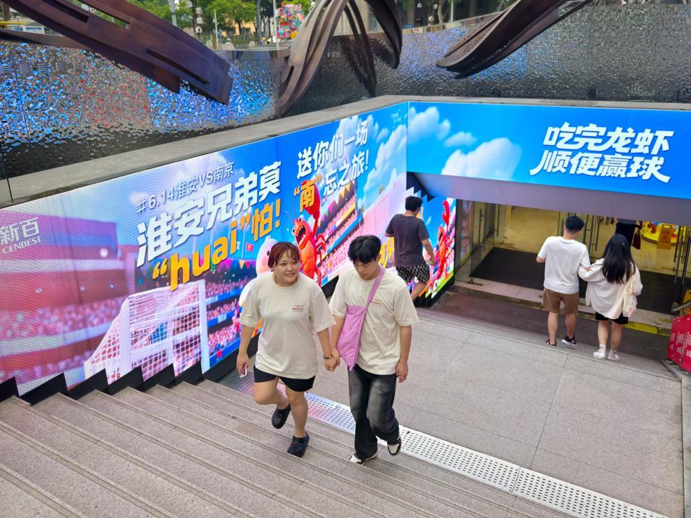 ↑6月10日,市民从南京一处商场的江苏城市足球联赛广告牌旁经过。