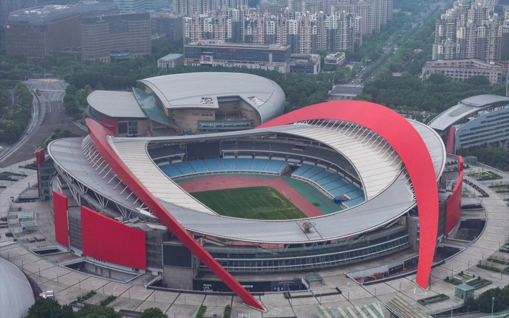 ↑这是6月9日拍摄的南京奥体中心全景(无人机照片)。