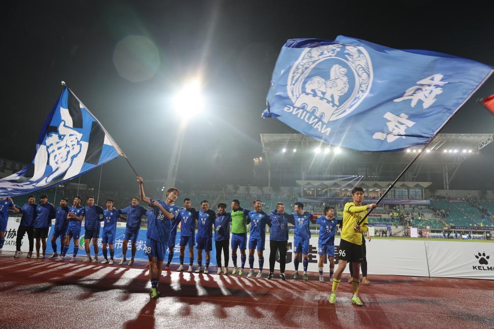 ↑6月1日,在2025年江苏省城市足球联赛第三轮南京队对阵无锡队的比赛后南京队球员向球迷致意。