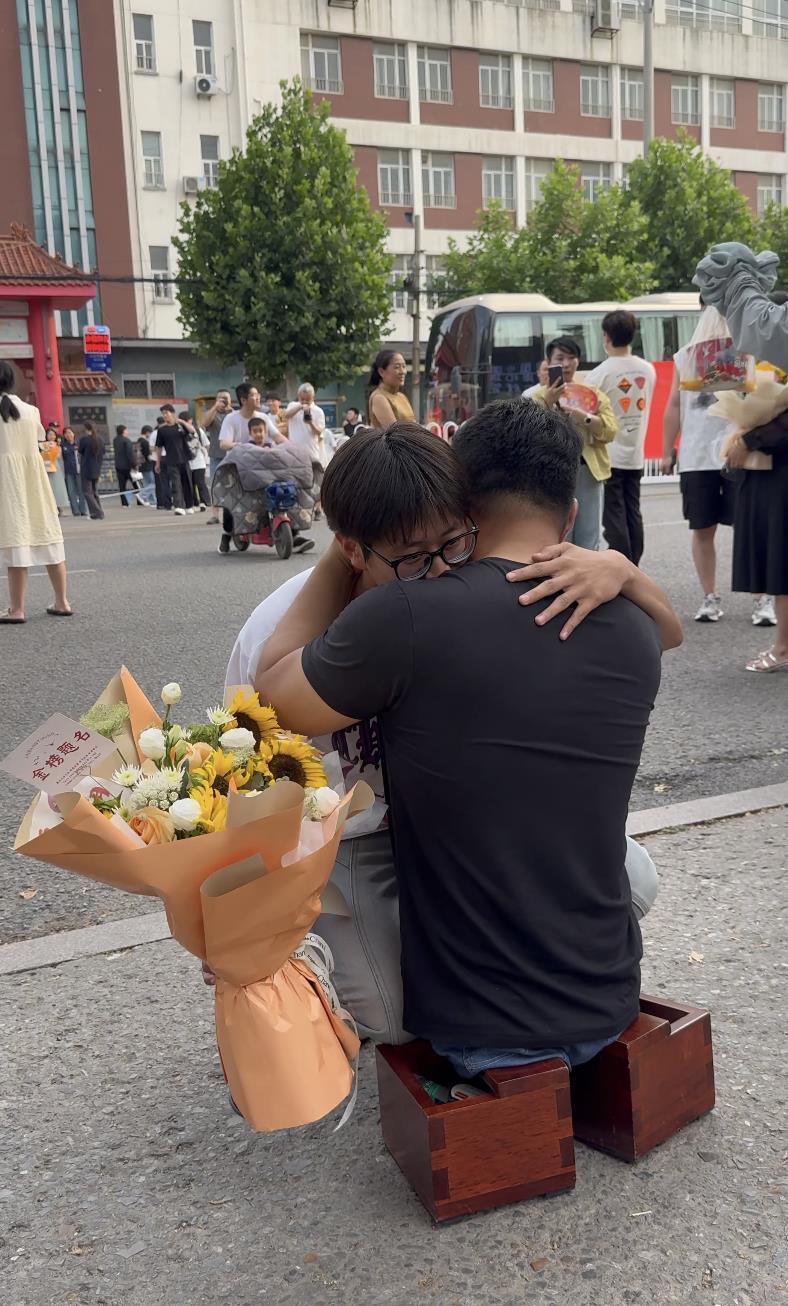 6月10日下午,2025年山东高考最后一门地理科目考试结束,在山东省临沂市第二十中学考点外,一位无腿父亲和其他家长一样,手捧鲜花等待着孩子走出考场。此时,一位戴着黑框眼镜的高个小伙儿径直走向这位无腿父亲,二人紧紧相拥。随后,小伙儿向父亲深深地磕头跪谢,父亲的眼泪夺眶而出。