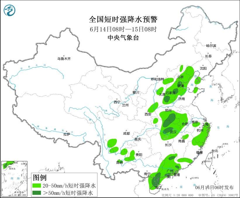 预计6月14日08时至15日08时,西北地区东部、华北、黄淮、江汉、华南南部等地的部分地区将有8级以上雷暴大风或冰雹天气,其中,山西中南部、河北南部、河南南部和西部、湖北北部、广东西南部等地的部分地区将有10级以上雷暴大风,最大风力可达11级以上;西北地区东部、华北、东北地区南部、黄淮、江汉、江南地区东部、西南地区南部、华南等地的部分地区将有小时雨量大于20毫米的短时强降水天气,其中,山西南部、河北中南部、天津、河南东南部、湖北中东部、广东中西部等地的部分地区小时雨量大于50毫米,最大可达70毫米以上。
