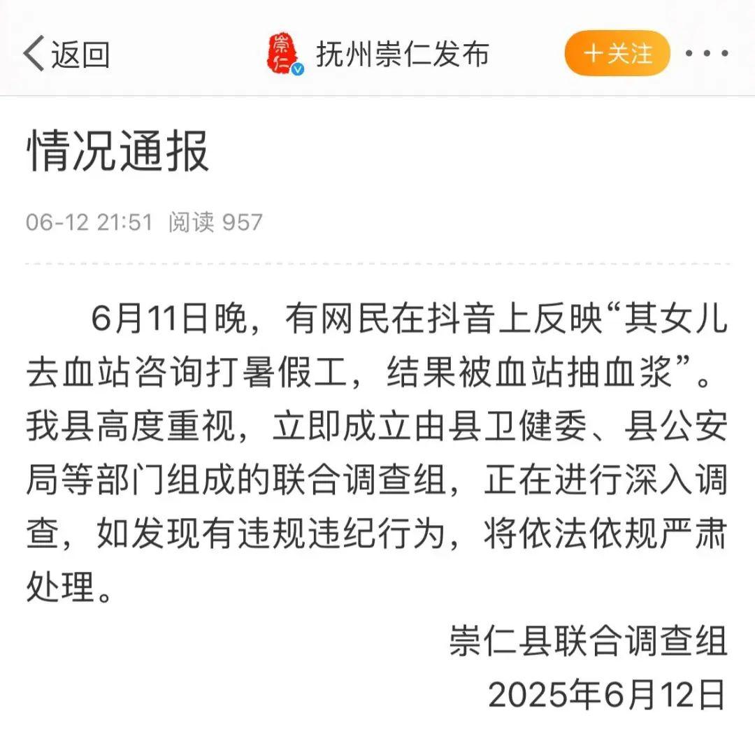 6月12日晚,江西抚州崇仁县联合调查组发布通报,称6月11日晚,有网民反映“其女儿去血站咨询打暑假工,结果被血站抽血浆”。崇仁县高度重视,立即成立由县卫健委、县公安局等部门组成的联合调查组,正在进行深入调查,如发现有违规违纪行为,将依法依规严肃处理。