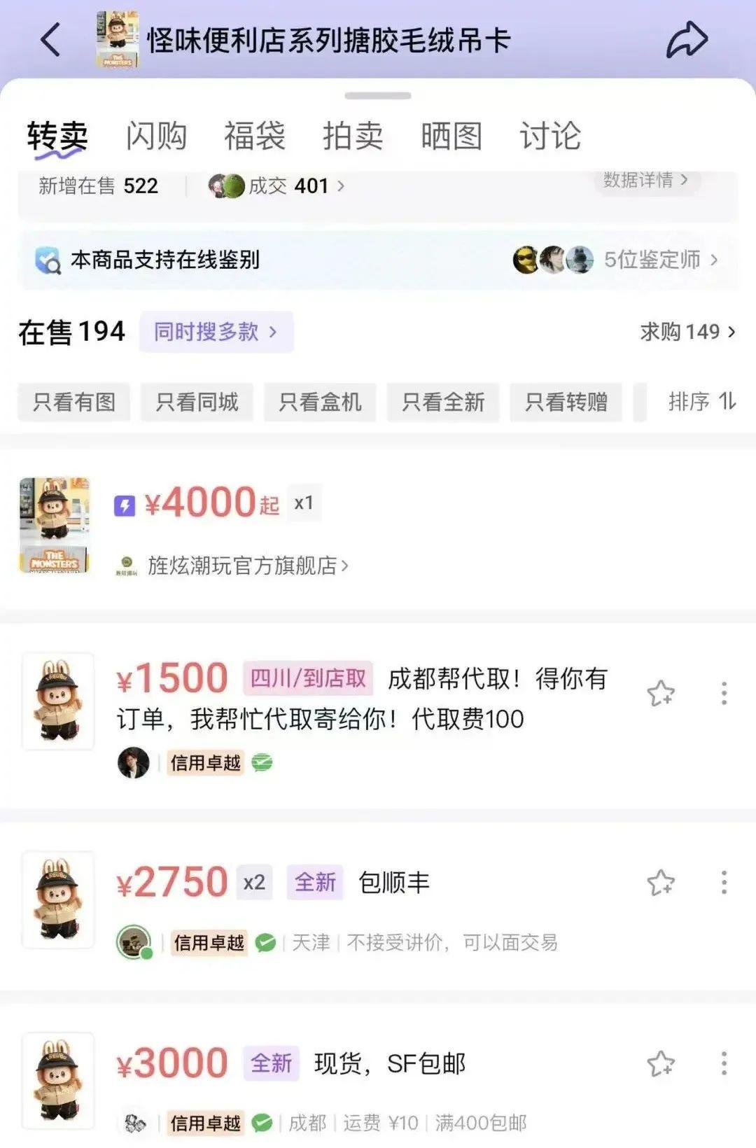 “一娃难求”的盛况也导致LABUBU的身价翻倍。二手市场上,此次发售的新品怪味便利店系列有的已经被炒到上千元(原价才199元)。