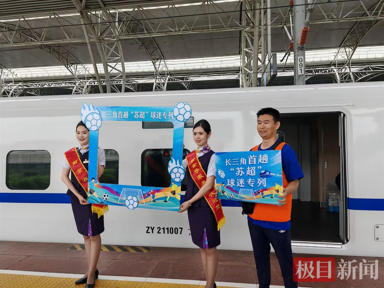 6月14日,极目新闻记者在南京站看到,专列早早停靠等候,球迷陆续检票进站,他们在车厢前合影留念,高喊“南京加油”。