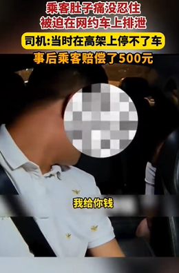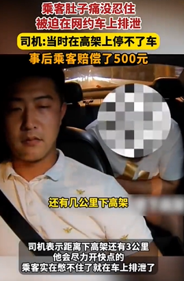 6月12日,上海有一名网约车司机发布了一则视频,当时他接了一位乘客去往目的地。上车五六分钟后,乘客感到肚子不舒服有点拉肚子。司机表示当时在高架上行驶,停不了车,想不到乘客竟然直接在车内排泄。司机称,由于乘客非主观故意,最后赔偿了500元,乘客下车后就去洗车了。