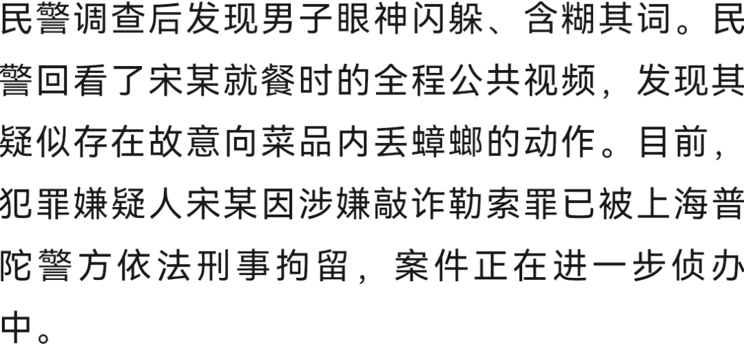近日,上海一名男子前往一家海底捞就餐时,称在火锅里发现了一只死蟑螂,要求店方10倍赔偿。店方查看后发现男子就餐时明显有向盘子里投放东西的动作,但男子拒不承认,并为了索赔自己报警。