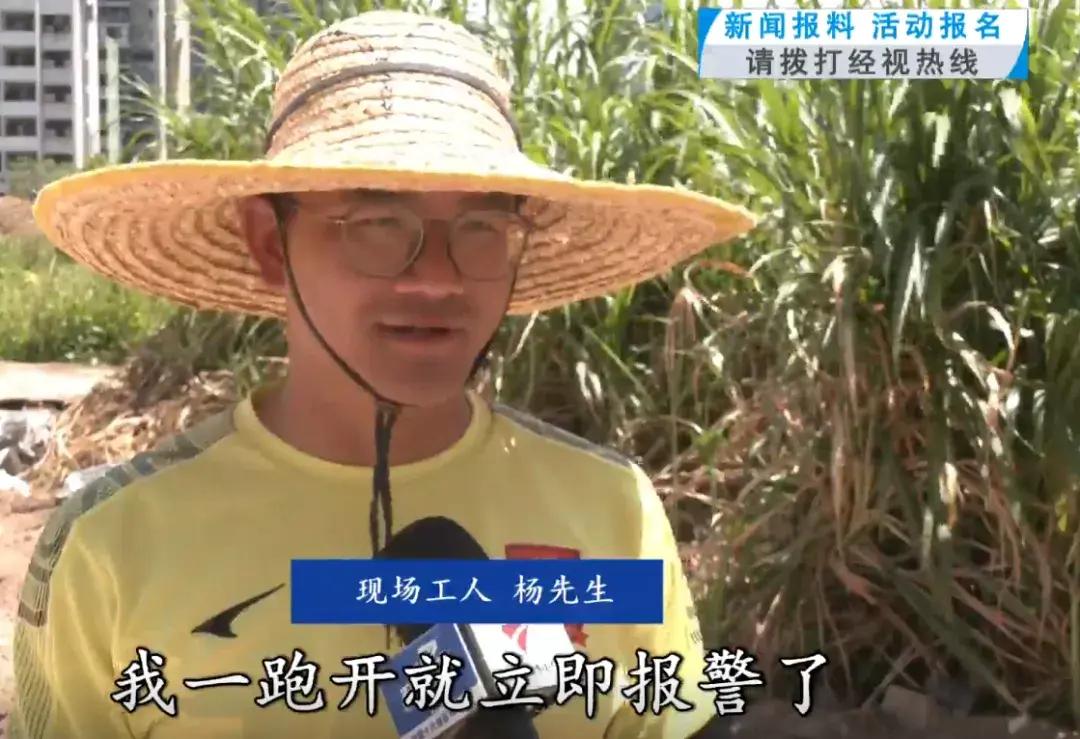 现场工人 杨先生:“当时我安排挖机在那里清表,然后我在这里看着,挖机挖到草堆那里动了一下,然后就出现了一条蟒蛇,当时就吓一跳了,从来没见过这么大的蛇,有我的脚这么粗,目测有两米多。”