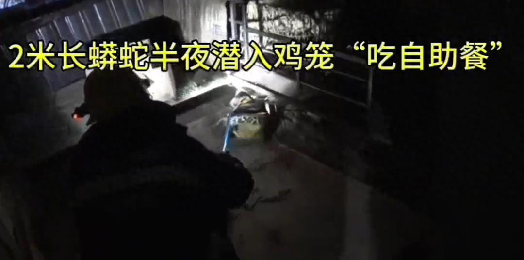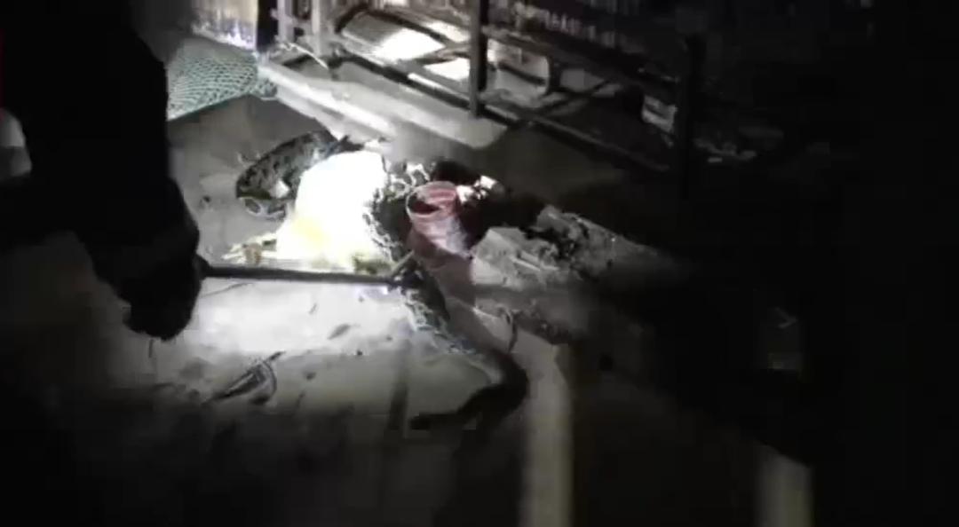 据了解,村民晚上喂鸡时发现少了一只鸡,随后听到急促的鸡鸣声,赶紧循声查看,发现鸡笼下有一条大蟒蛇正在用身体紧紧卷着一只鸡,受惊的场主立即报警求助消防部门。