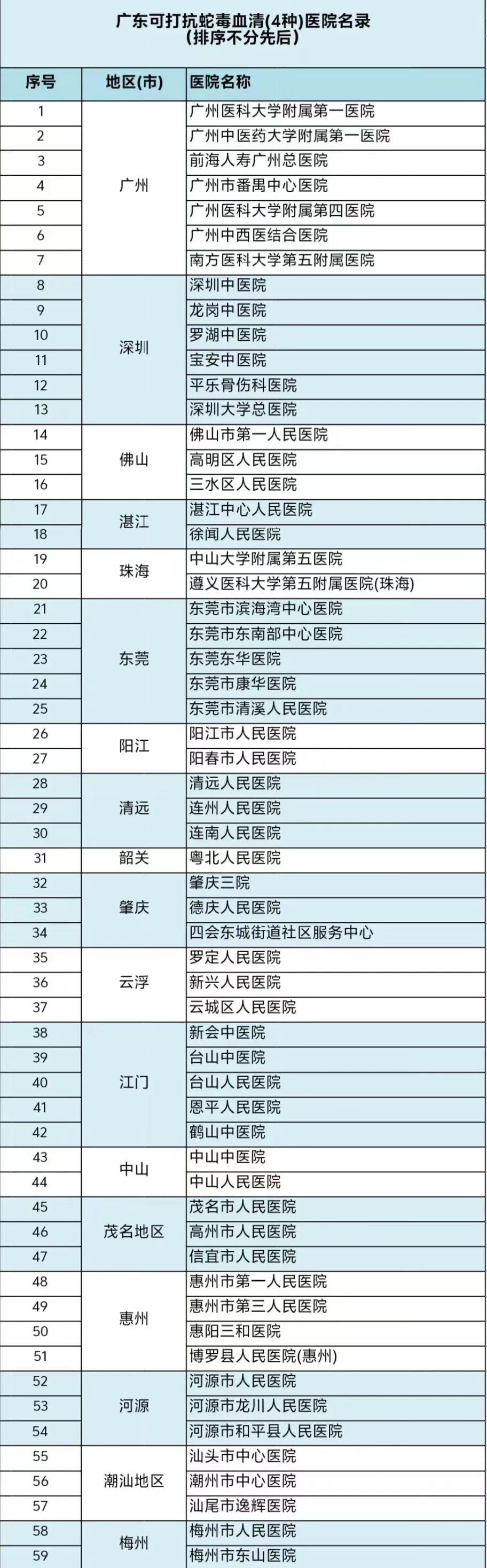 广东可打抗蛇毒血清医院名录(部分)