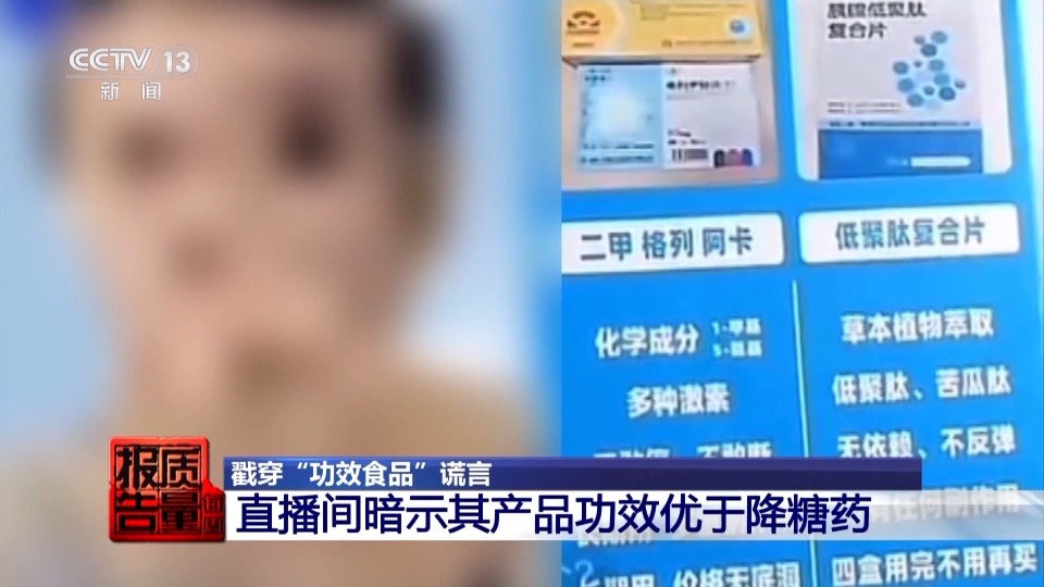 上海市消保委副秘书长 唐健盛:个别直播间就直接说吃了这个食品,可以把高血糖的人变成普通人,可以把家里的胰岛素全部扔掉。让消费者可以停药不吃药,这不仅是虚假宣传,更是一种害人的行为。这些原料根本不可能达到这个效果。