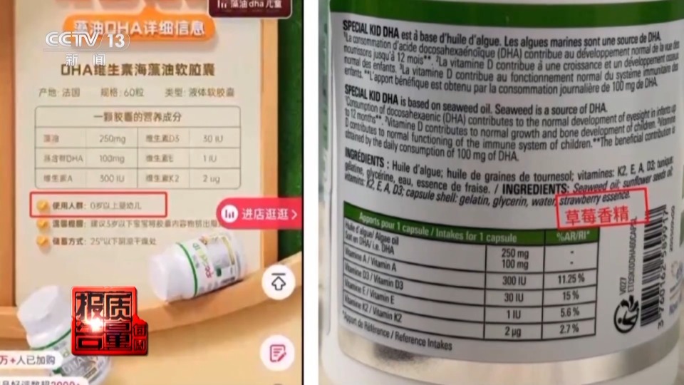 记者注意到,在网络直播间中,不少食品还宣称有益婴幼儿健康。直播过程中,带货主播宣称某款海藻油产品中不含“香精”,但产品的配料表中清晰标注着具有“草莓香精”成分。