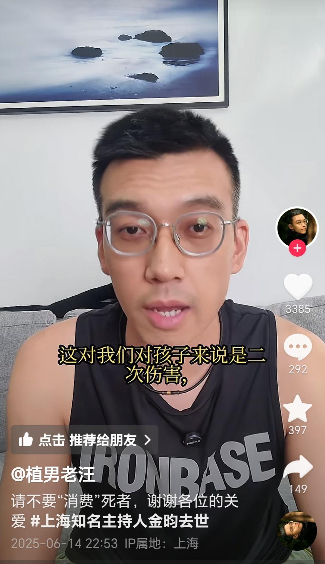 6月14日,金昀丈夫通过个人账号“植男老汪”发布视频辟谣称,发视频透露金昀去世消息的是一位金昀生前的同事,但其与金昀并非“闺蜜”,所发视频中“带孩子去日本”“一百多次病危”等内容,也完全不符合事实。