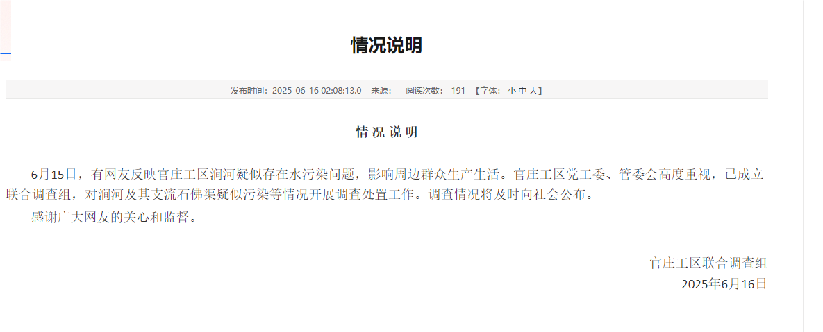 6月15日,有网友反映官庄工区涧河疑似存在水污染问题,影响周边群众生产生活。官庄工区党工委、管委会高度重视,已成立联合调查组,对涧河及其支流石佛渠疑似污染等情况开展调查处置工作。调查情况将及时向社会公布。