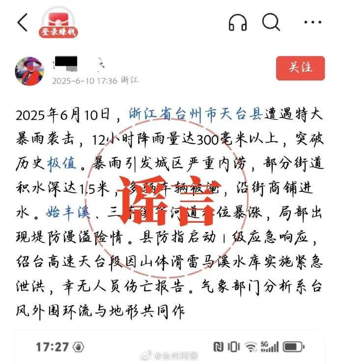 近日,浙江省台州市天台县遭遇强降雨天气,局部地区雨量较大,天台县气象部门多次发布暴雨预警提醒广大群众高度警惕,切实做好各项防范措施确保生命财产安全 。然而却有个别网民为了博关注、蹭流量发布谣言混淆视听。