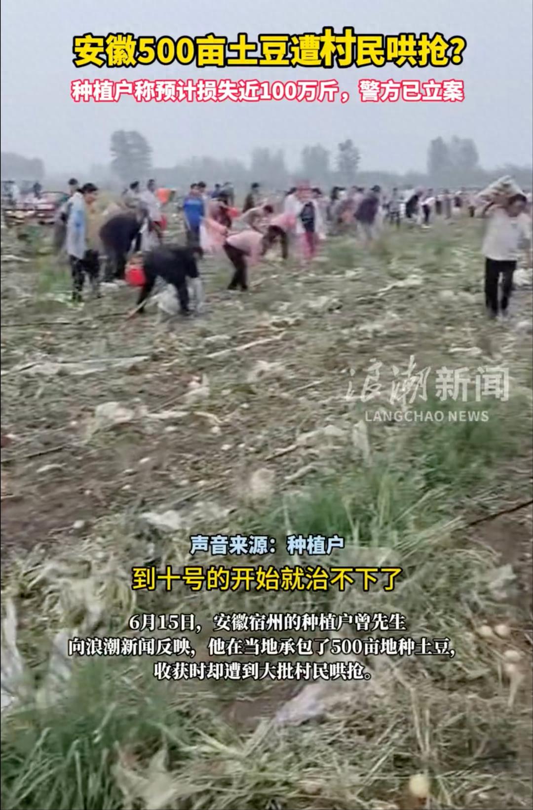 6月15日,安徽宿州的种植户曾先生向浪潮新闻反映,他在当地承包了500亩地种土豆,收获时却遭到大批村民哄抢。种植户称,哄抢从6月10日开始加剧,最多时一天有数百上千村民赶来抢挖土豆,目前损失土豆预计近100万斤。