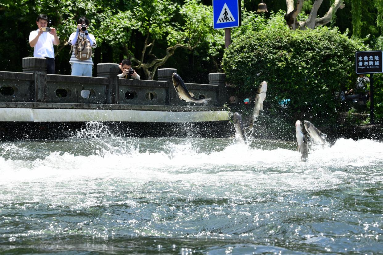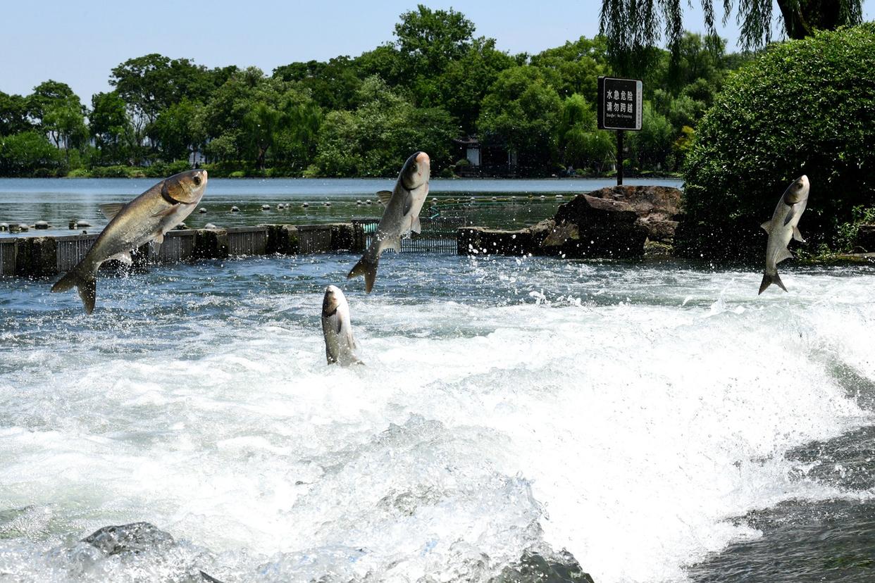 “听朋友说早上七八点也拍到了鱼跃画面,我是临近中午过去的,那时还有很多鱼持续跃出,我拍到了四五条鱼同时起跳的场景。”西湖摄影爱好者里尔告诉记者,这片区域每年梅雨季都有摄影爱好者赶去拍,尤其是中高考季,鱼跃的画面表达了好的寓意。