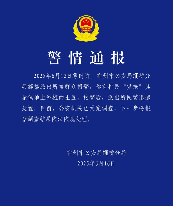 安徽宿州市公安局埇桥分局6月16日通报,6月13日零时许,宿州市公安局埇桥分局解集派出所接群众报警,称有村民“哄抢”其承包地上种植的土豆,接警后,派出所民警迅速处置。目前,公安机关已受案调查,下一步将根据调查结果依法依规处理。