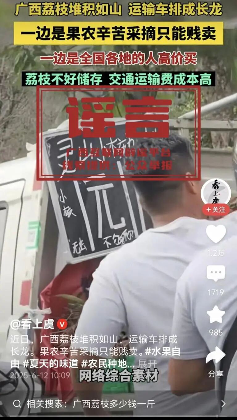 6月12日,网络流传“近日广西荔枝堆积如山,运输车排成长龙。果农辛苦采摘只能贱卖”的视频,其中画面显示荔枝堆积和“灵山荔枝1元”字样。经核查,视频内容并非发生在灵山县。