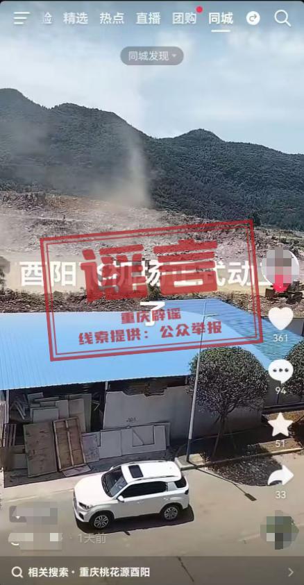 该视频显示,有一辆渣土车正在一建筑工地作业,现场尘土飞扬,并配文称“酉阳飞机场正式动工了”,点赞将近400次,评论将近100条。