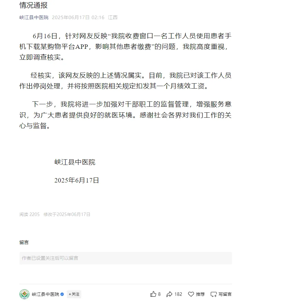 17日凌晨,峡江县中医院发布公告称,针对网友反映“我院收费窗口一名工作人员使用患者手机下载某购物平台APP,影响其他患者缴费”的问题, 经核实,该网友反映的上述情况属实。目前,峡江县中医院已对该工作人员作出停岗处理,并将按照医院相关规定扣发其一个月绩效工资。