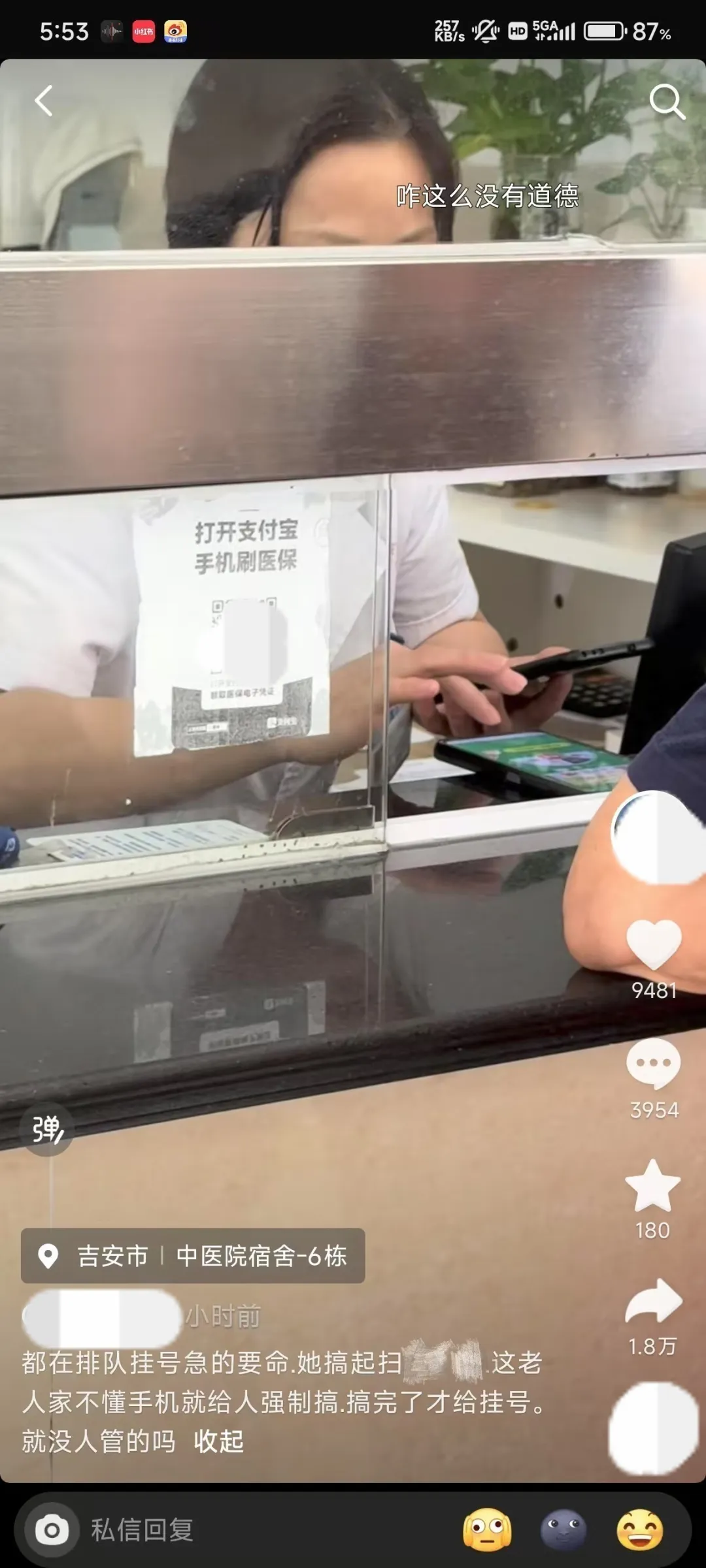 在视频的评论区,有网友表示,“人家碰到熟人扫了一下而已,当时是中午还没上班,后面没有人排队挂号。”对此,视频发布者回应,“本人来了,后面有人排队,反光都反出来了。”还有网友表示,“就是有人在排队,这种时候,就不应该要求别人来帮你操作扫码。”