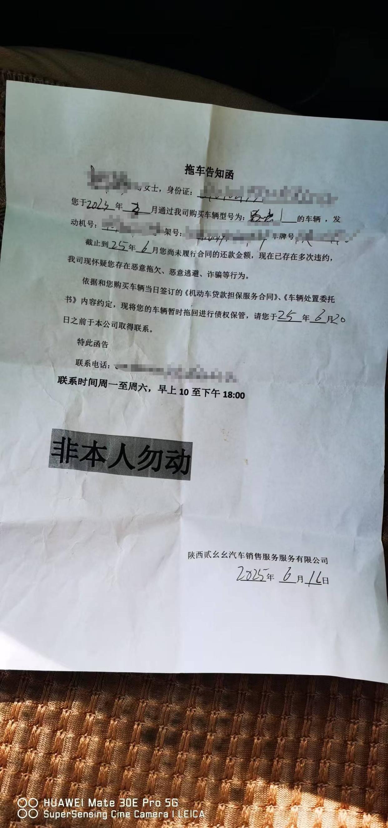 车位上留了一张纸条,抬头写着“拖车告知函”:李××先生,您于2023年3月通过我司购买路虎汽车,截止2025年6月您尚未履行合同还款金额,现已存在多次违约,我司怀疑您存在恶意拖欠、恶意逃避、诈骗行为。现将您的车辆暂时拖回进行债权保管。请您与本公司联系。落款为陕西贰幺幺汽车销售服务有限公司。
