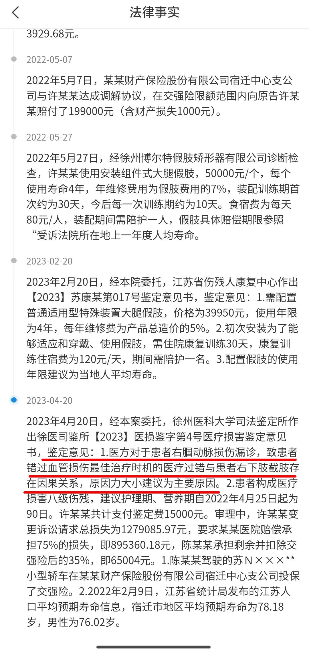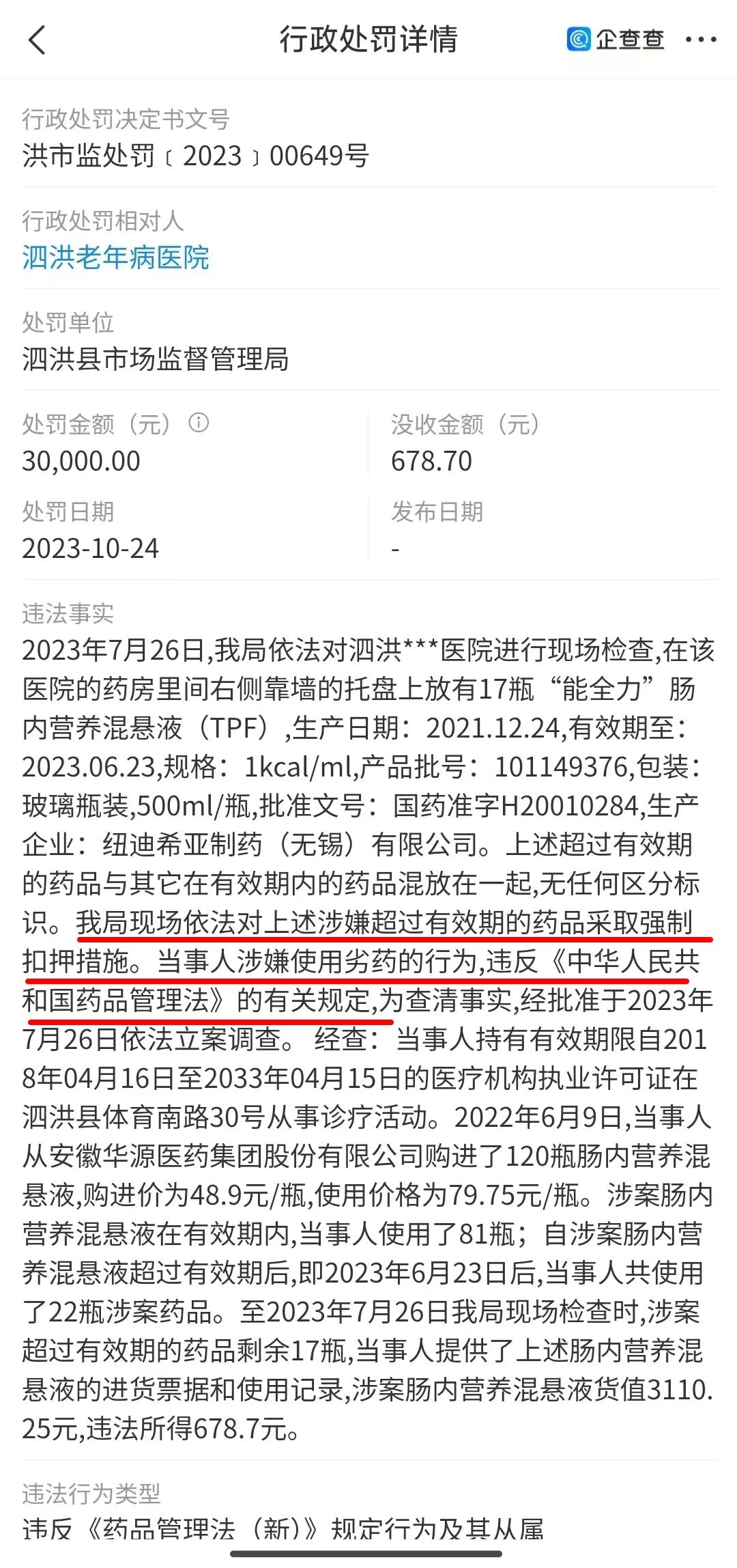 据资料显示,此前,这家江苏泗洪老年病医院就因在药品管理方面的违规行为受到行政处罚。执法人员曾在其药房发现17瓶超过有效期的 “能全力”肠内营养混悬液与正常药品混放且无区分标识,涉嫌使用劣药,该行为违反了《中华人民共和国药品管理法》。医疗事故方面,2022年4月,许某某遭遇交通事故后被送往该医院治疗。然而,医院对其右腘动脉损伤漏诊,致使患者错过血管损伤最佳治疗时机。2023年4月,经徐州医科大学司法鉴定所鉴定,医方的医疗过错与患者右下肢截肢存在因果关系,且认定为主要原因。最终法院判决该医院赔偿许某某各项损失850602元。