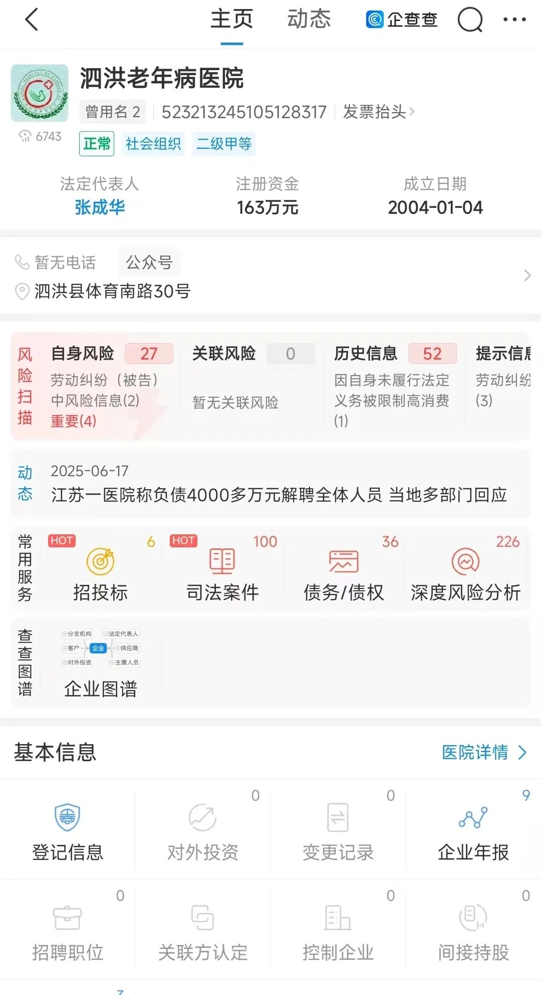 泗洪县卫健局工作人员回应称,不清楚此事。泗洪县民政局工作人员告诉记者:该医院是民办非企业单位,在该局登记,目前尚未注销。泗洪县人社局工作人员表示,目前该局仲裁院已介入此事,正在处置中。