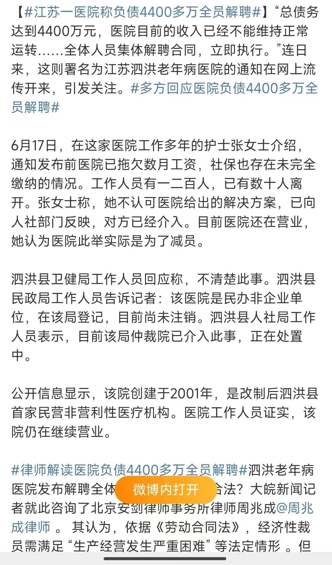 近日,被传负债4400万的江苏泗洪老年病医院一则全体人员集体解聘的通知,在网络上引发广泛关注。