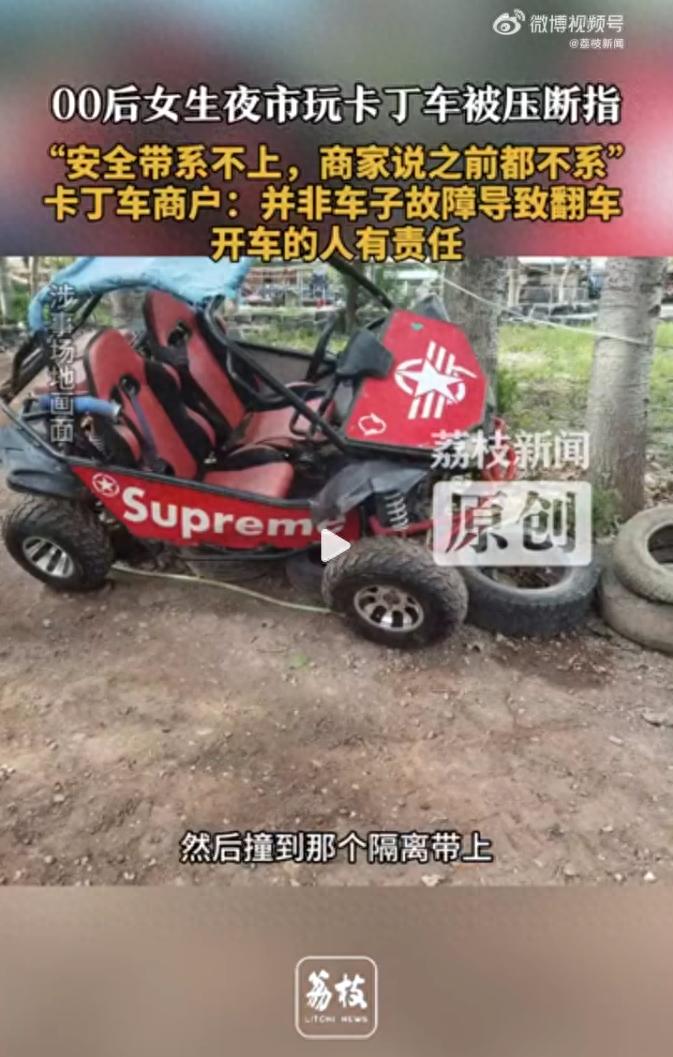 刘女士告诉@荔枝新闻,4月24日晚,自己和朋友在北京的某夜市玩卡丁车,因意外翻车压到手,右手小指骨折缺损。“上车时安全带系不上,我就问收钱的人,他说不用系,前面都不系。当时我朋友开车,我坐在副驾驶,压到石头上之后撞到隔离带就翻了,翻了之后就把我手指给压了。”