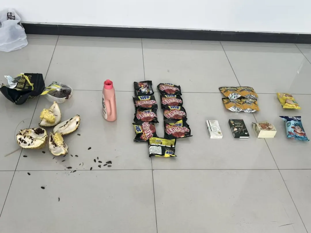 不仅有四散的水果、零食、瓜子壳