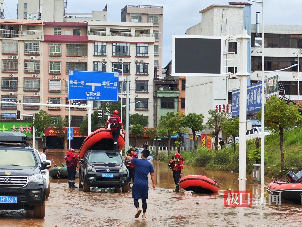 站前大道至幸福一路往东,路面已经全部被淹,目及之处水位最深没过大腿。下午时分,救援人员不时划着冲锋艇从受灾居民区将被困人员转移出来。