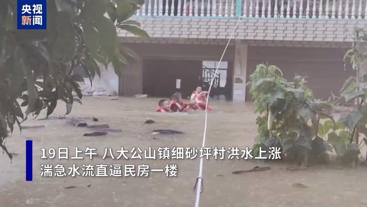 19日上午,桑植县八大公山镇细砂坪村洪水持续上涨,湍急水流直逼民房一楼。危急时刻,镇村党员干部冒雨展开紧急救援。救援人员将绳索固定在民房二楼栏杆,身穿救生衣,横渡急流,给被困群众穿戴救生设备后,架起受困村民,由一名救援人员紧拽绳索开路,众人协力横穿洪流,最终成功转移2户6名群众。
