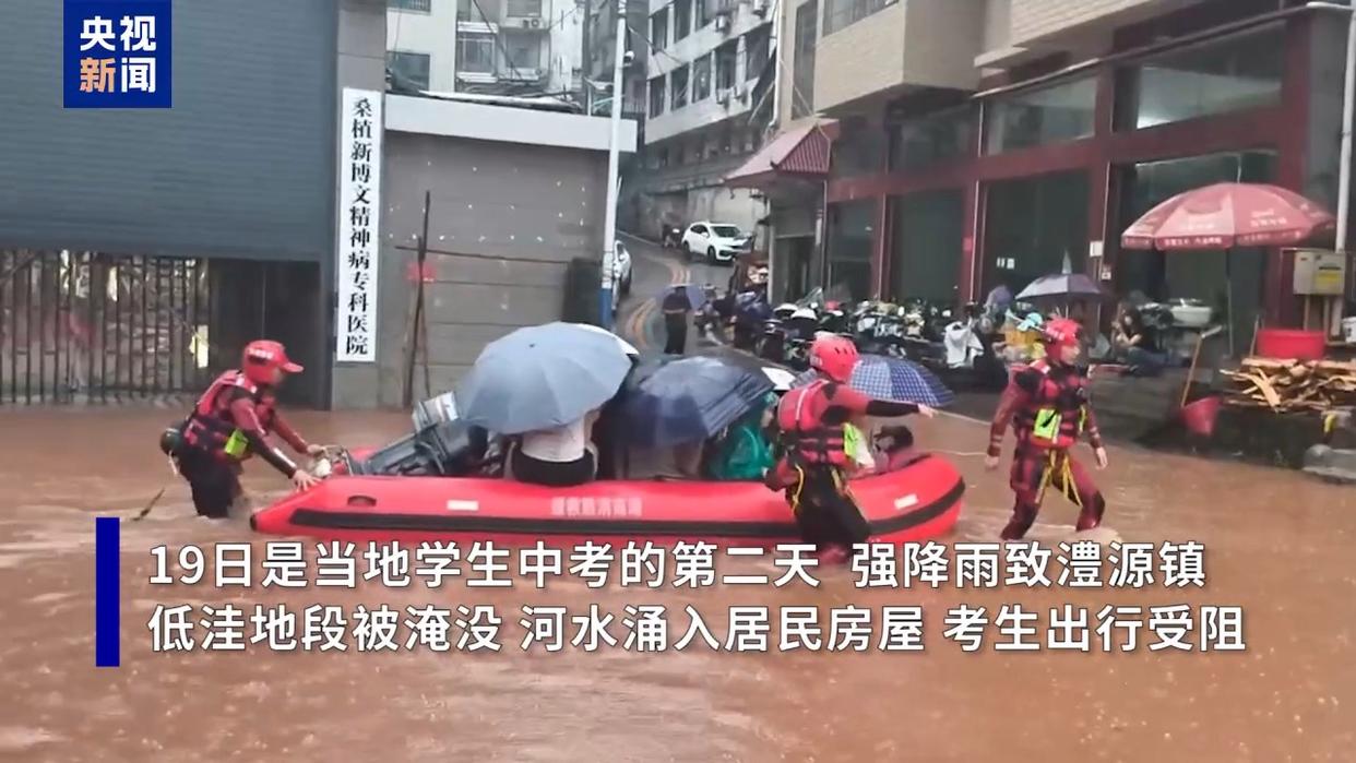 6月19日是桑植县学生中考的第二天,凌晨4点多,强降雨致澧源镇八斗溪路段部分低洼地段被淹没,河水倒灌进入居民房屋,部分考生出行受阻。当地镇政府、社区干部和消防救援人员迅速赶到现场,操控皮划艇穿梭在积水街巷,打通护考路,将考生运送至没有积水的地方。截至19日7点半,被困群众基本转移完毕,总转移245名群众,其中学生30人,包括12名中考生。