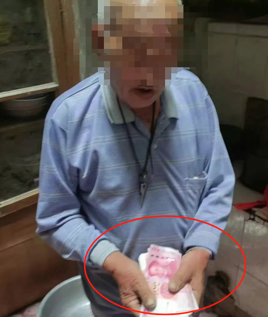 年迈的老人颤巍巍地捧着现金,心情激动,泪水顺着满脸的皱纹流下。