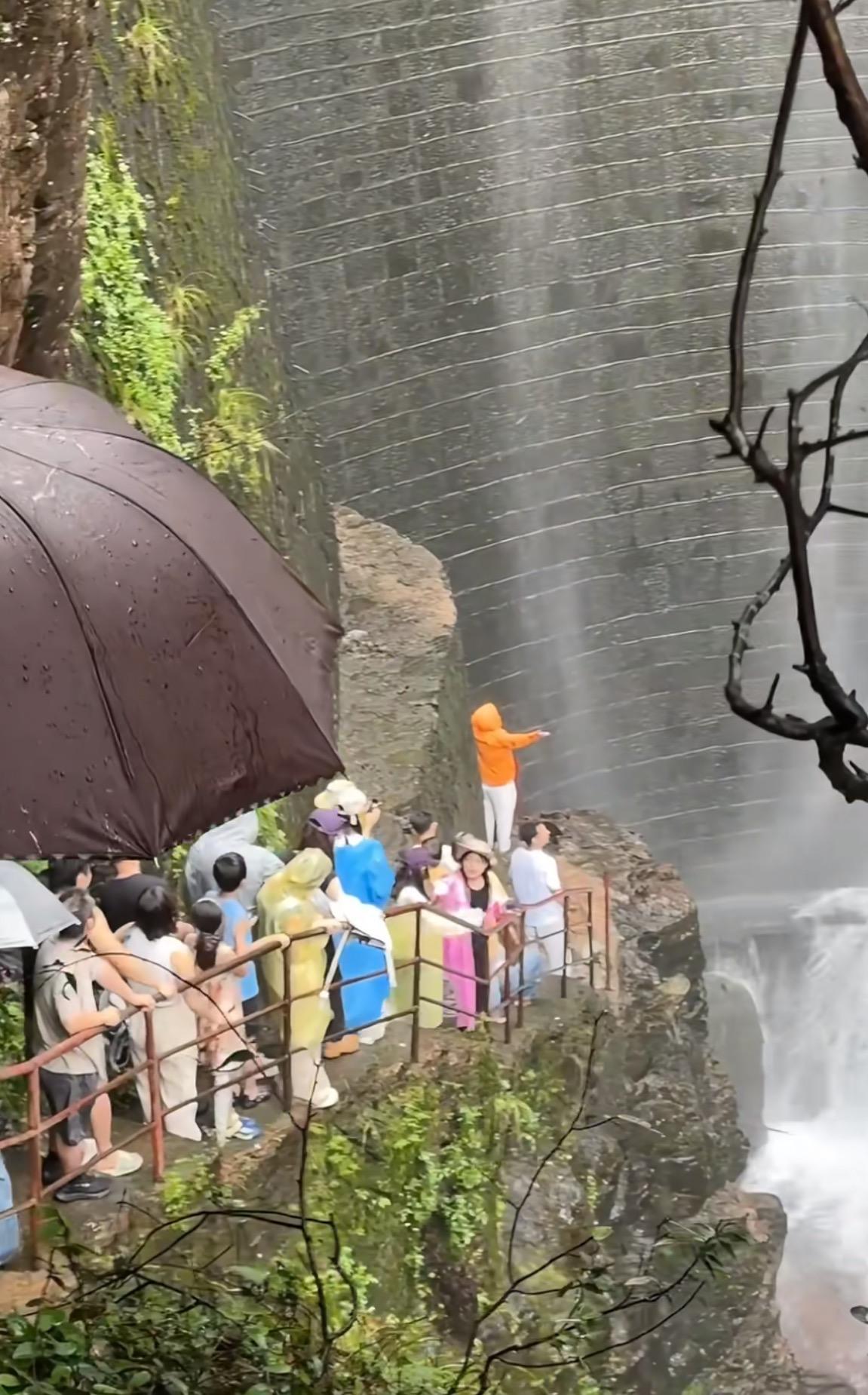 “游客要进入亲水小道,近距离拍下和瀑布的合影,需要先翻过一道围栏。进入小道后,路面和台阶比较湿滑。还有部分人会走到小道最前方的打卡点,那里水流大,有风,而且无遮拦,还是比较危险的。”她说。