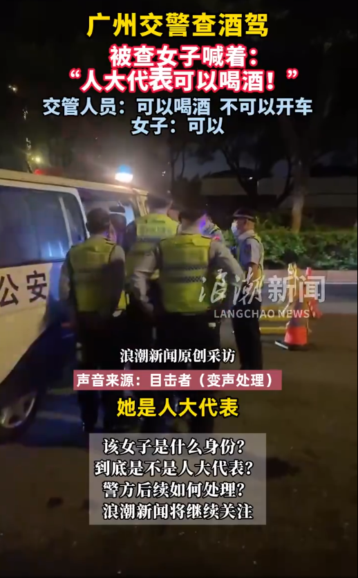6月19日,有网友反映,广州交警在当天凌晨查获一名涉嫌酒驾女子,其自称是人大代表并试图抗拒执法据。报料网友介绍,他于18日晚上11时许经过广州市天河区车陂路,遇到交警正在设卡查酒驾。“这个女的远远看到前面有交警,就把车子停到路边,打电话找代驾。”该网友称,等代驾到场时,交警已经发现异常,“她想下车离开,然后警察就上去抓她,她一直在反抗。”“她看跑不掉了,后面就说自己是人大代表。本来我都准备走了,听到她这样说,可能是想靠人大代表的身份逃避处理,就掏出手机拍摄了……”该网友如是说。该网友提供的视频显示,当事女子被多名交管人员围在警车旁,女子突然大喊道:“人大代表可以喝酒!”一名交管人员接话:“可以喝酒,不可以(酒后)开车!”但该女子仍然坚持说“可以”。19日中午,记者致电广州市天河区人大常委会了解情况,接线工作人员表示还没有听说该情况,建议记者联系交警。记者随后联系到广州交警天河大队,询问该女子的身份及最终处理结果,交警工作人员表示将安排专人答复。截至记者发稿时,尚未给出答复。