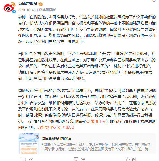 6月19日,微博发布公告称,站方发现,有部分用户在参与争议讨论时,因公开声称被网暴而导致更多网友相互攻击、增加网络暴力风险。为此站方将对现有防网暴机制进行进一步升级,以此加强对用户的保护,具体如下:当用户受到言语攻击风险时,平台会自动提醒用户开启“一键防护”等相关机制,并已取得显著的防范效果。在此基础上,对于用户公开声称自己被网暴或晒出被言论攻击截图的,平台在核实后将主动为其开启为期7天的“一键防护”模式进行保护,功能开启期间将不会接收未关注人的私信/评论/转发/@ 消息,不会被关注/搜索到,以此降低用户遭受言论攻击的风险。