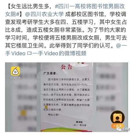 此前四川一高校因为图书馆考研女生占比多,就将其中一层男厕所改为女厕。