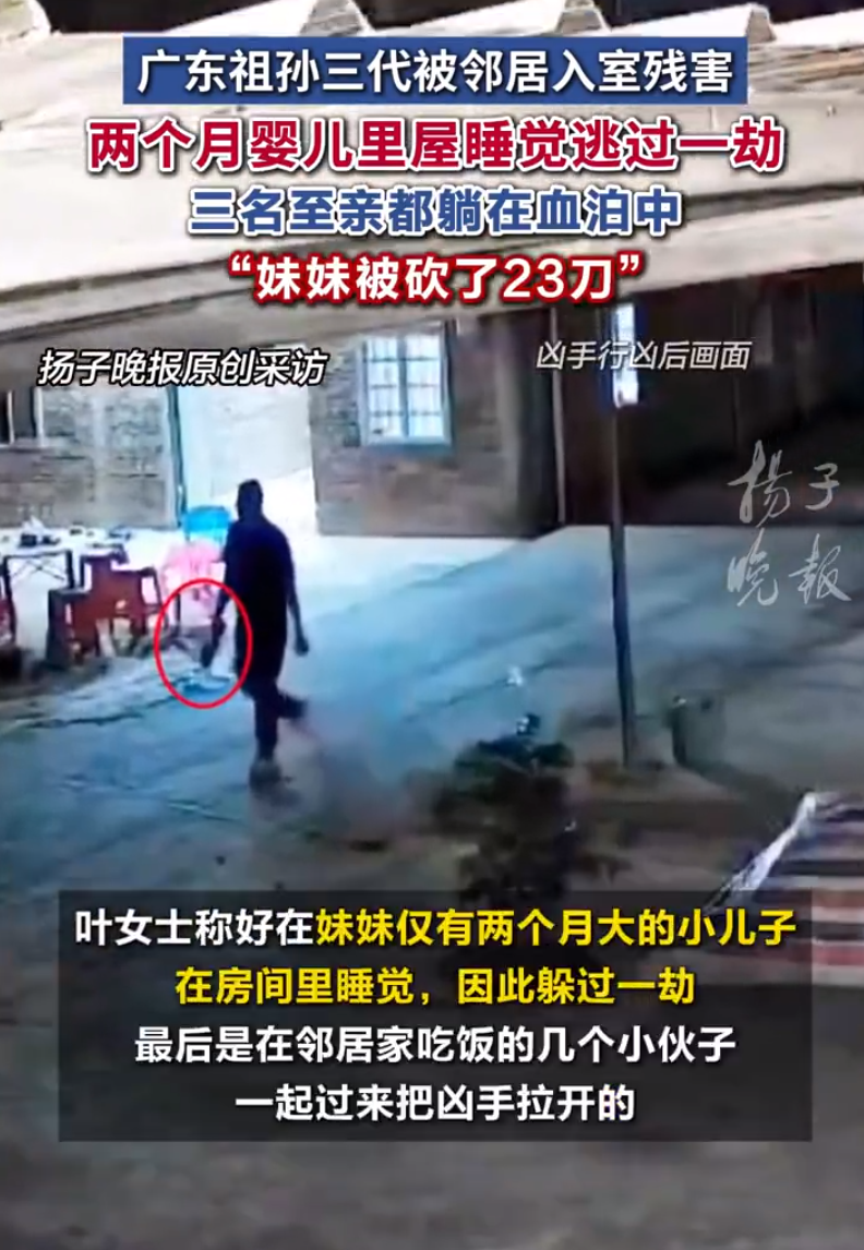 据当时第一个赶过去的邻居称,凶手先是砍向了叶女士的妹妹,又去砍叶女士母亲和妹妹的孩子。“好在我妹妹仅有两个月大的小儿子,在房间里睡觉,因此躲过一劫。最后几个小伙子一起过来把凶手拉开了。”