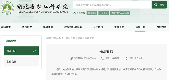 湖北省农业科学院6月20日发布情况通报称,近日,关注到网络上反映该院公开招聘中有关问题,该院高度重视,决定暂停相关岗位的招聘程序,依法依规启动调查,并及时通报。