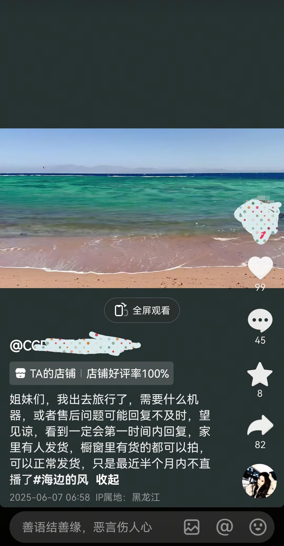 极目新闻记者获悉,邱燕来自黑龙江,生前是一家经营CCD数码相机网店的店主。北京时间6月19日晚,该账号在网络平台发布消息,称主播于6月18日上午9时,在印尼粉红长滩不幸遇难逝世,家属正在积极处理善后事宜。记者注意到,6月7日,该主播曾发布消息,称需要外出旅行半个月,其间相机可正常发货,只是暂停直播。
