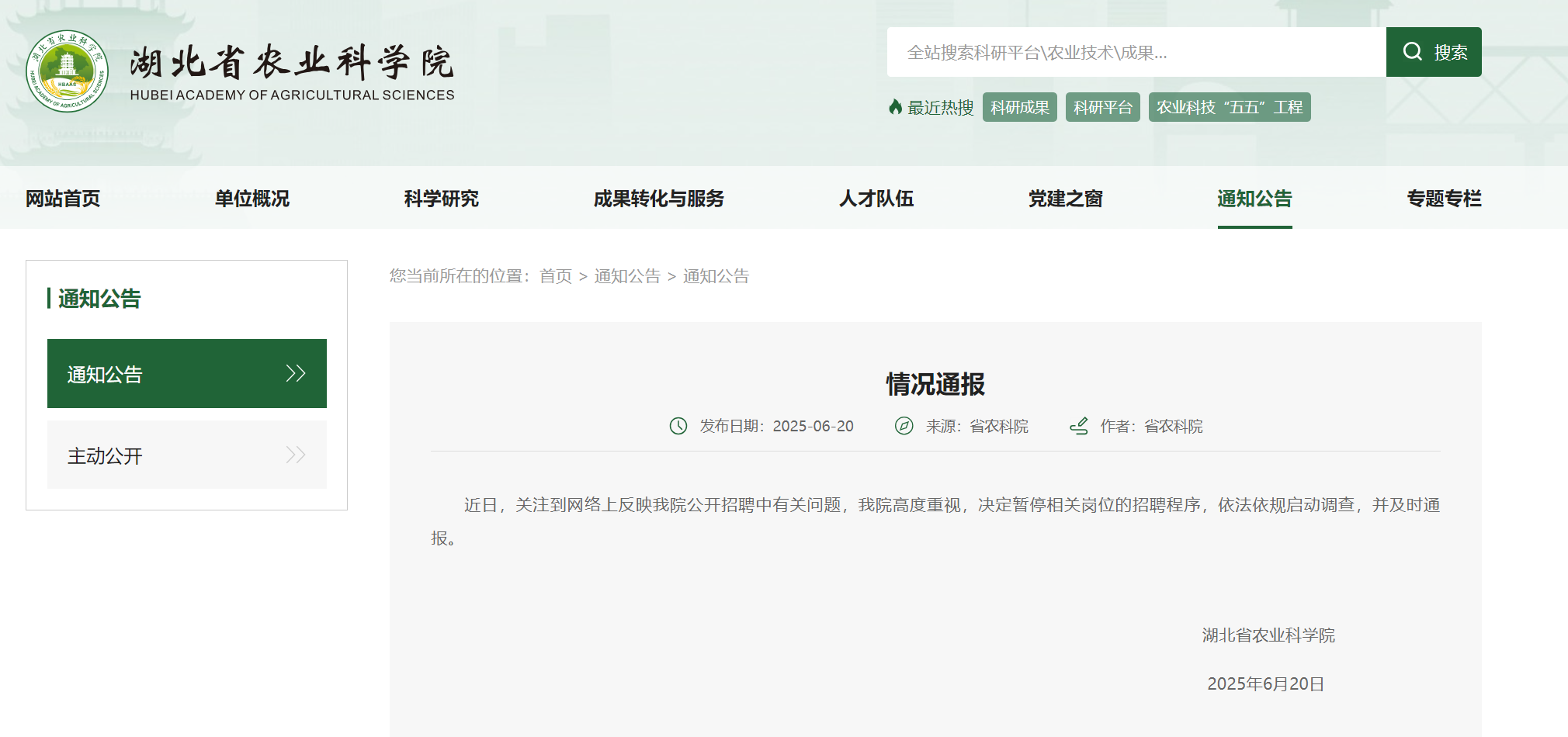 湖北省农科院发布情况通报称,“近日,关注到网络上反映我院公开招聘中有关问题,我院高度重视,决定暂停相关岗位的招聘程序,依法依规启动调查,并及时通报。”