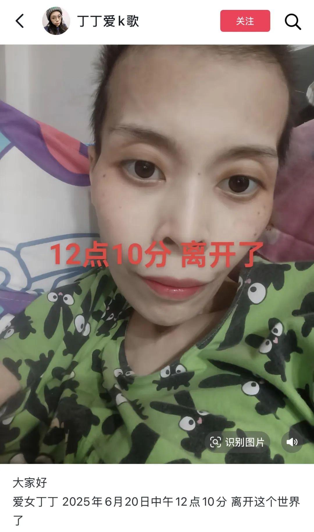 6月20日,抗癌博主“丁丁爱k歌”在社交平台发文称,卵巢癌晚期的钢琴老师丁丁离世。其父亲向记者证实,丁丁(原名梁东妮)已于6月20日中午12点10分去世。
