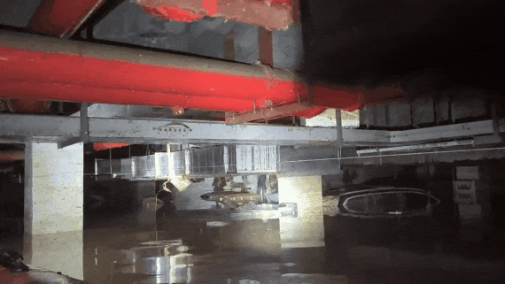 在排水口旁整整守候20个小时后,车库水位艰难下降至可进入的程度。
