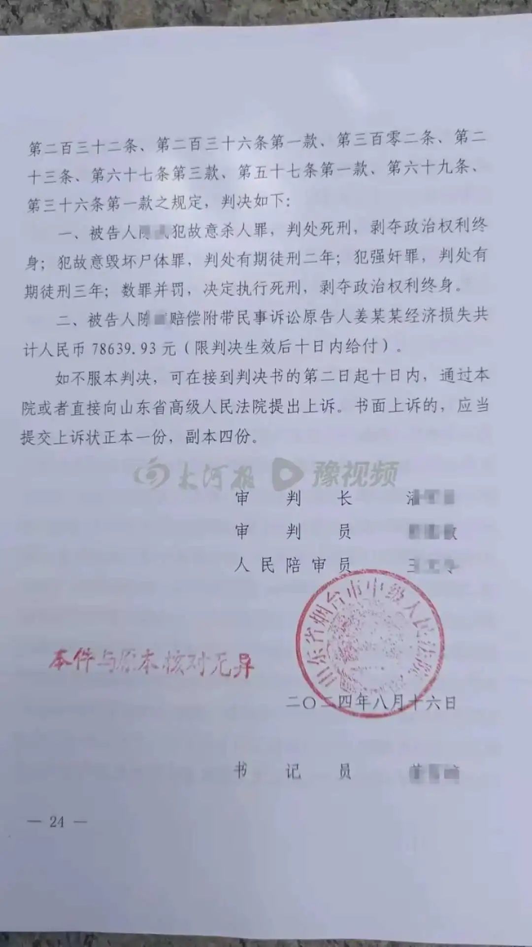 2024年8月16日,山东省烟台市中级人民法院一审判决:被告人陈某犯故意杀人罪,判处死刑,剥夺政治权利终身;犯故意毁坏尸体罪,判处有期徒刑二年;犯强奸罪,判处有期徒刑三年;数罪并罚,决定执行死刑,剥夺政治权利终身。被告人陈某赔偿附带民事诉讼原告人姜某某经济损失共计人民币78639.93元(限判决生效后十日内给付)。