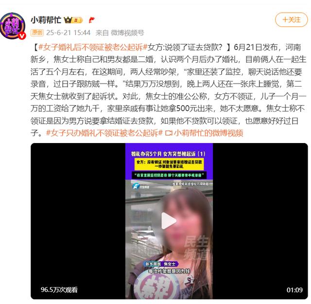 6月21日发布,河南新乡,焦女士称自己和男友都是二婚,认识两个月后办了婚礼,目前俩人在一起生活了五个月左右,在这期间,两人经常吵架,“家里还装了监控,聊天说话他还要录音,过日子跟防贼一样。”结果万万没想到,晚上两人还在一张床上睡觉,第二天焦女士就收到了起诉状。