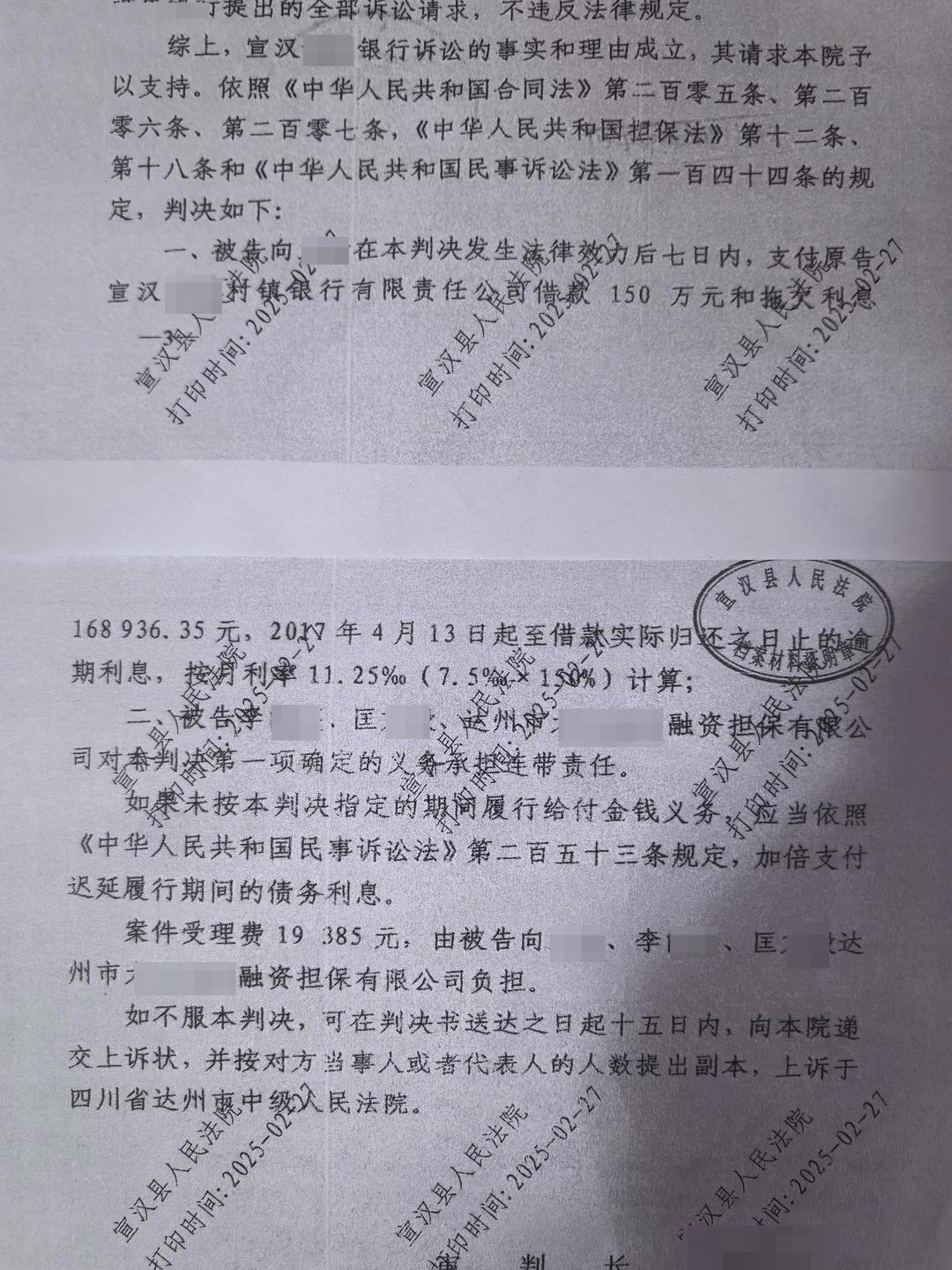 2017年,宣汉某村镇银行提起诉讼。宣汉县人民法院民事判决书载明,宣汉某村镇银行将向先生及其妻子、匡某毅、达州市某融资担保有限公司一同起诉归还其本金150万元及相关利息。最终判决宣汉某村镇银行有限公司胜诉。