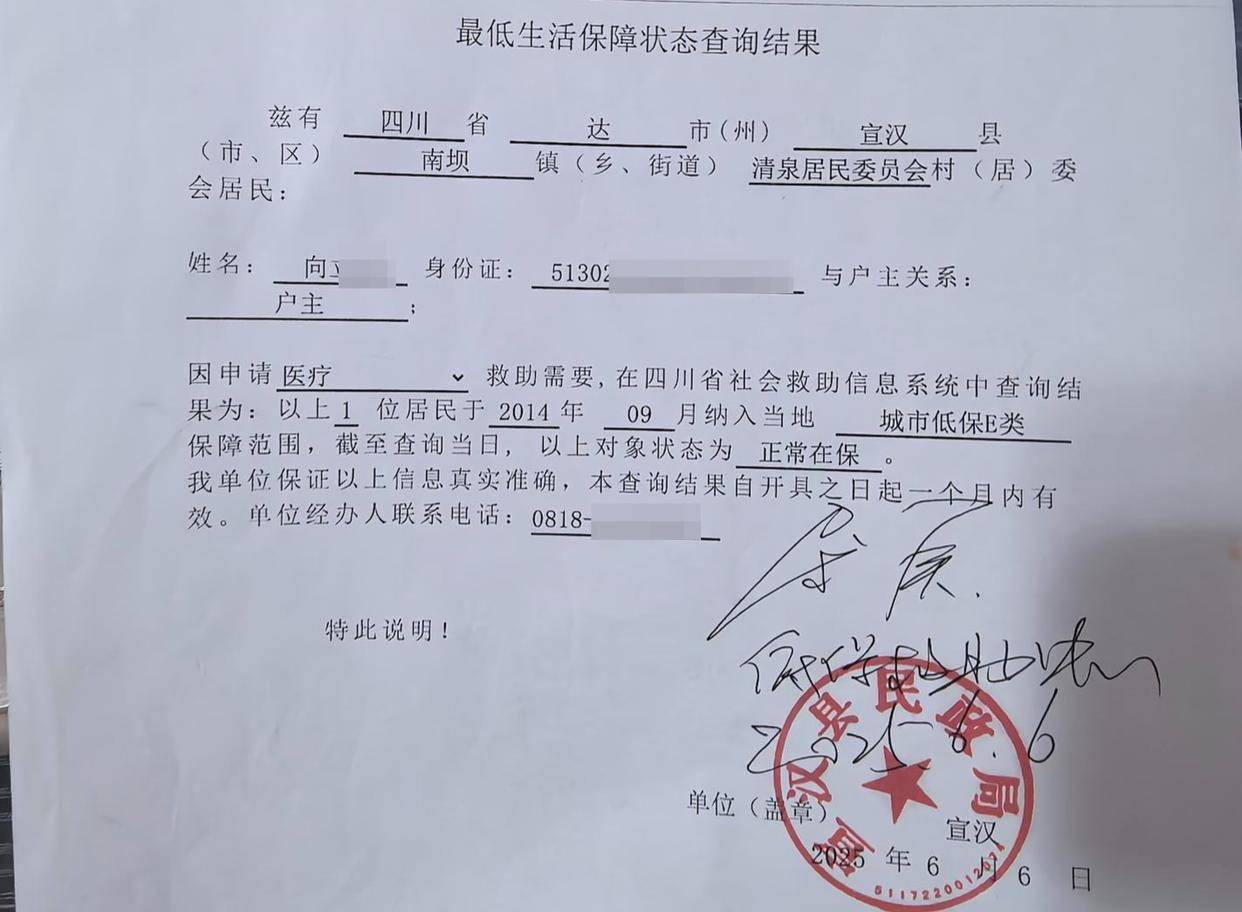 经宣汉县民政系统查询,向先生2014年9月纳入城市低保E类保障范围,至今一直在领取低保。